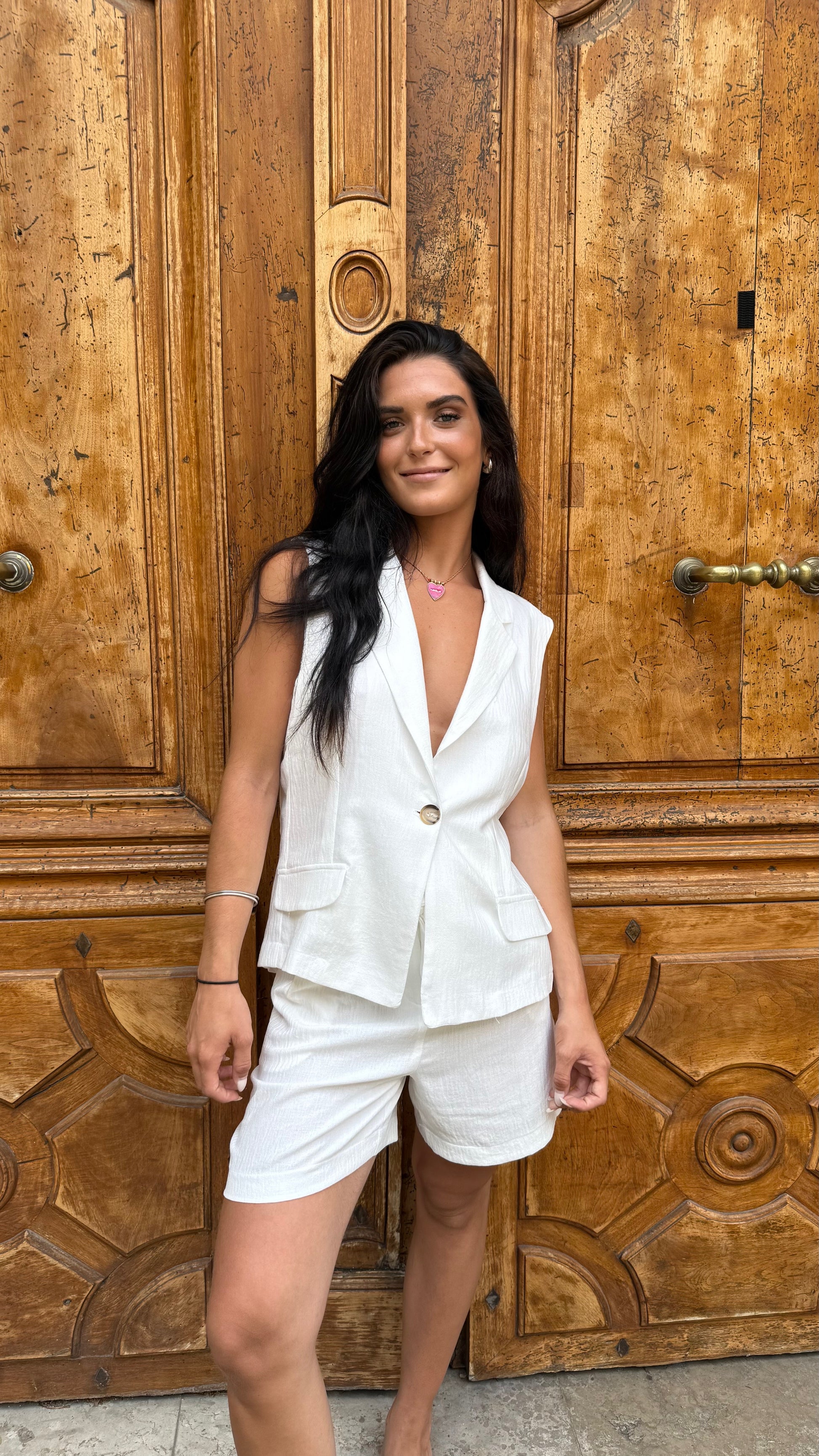 Chic et minimaliste, cet ensemble blanc sans manches est la pièce parfaite pour un look à la fois structuré et décontracté. Composé d’un blazer cintré à bouton unique et d’un short assorti à taille haute, cet ensemble offre une silhouette élégante tout en restant très confortable, grâce à son tissu léger effet texturé.