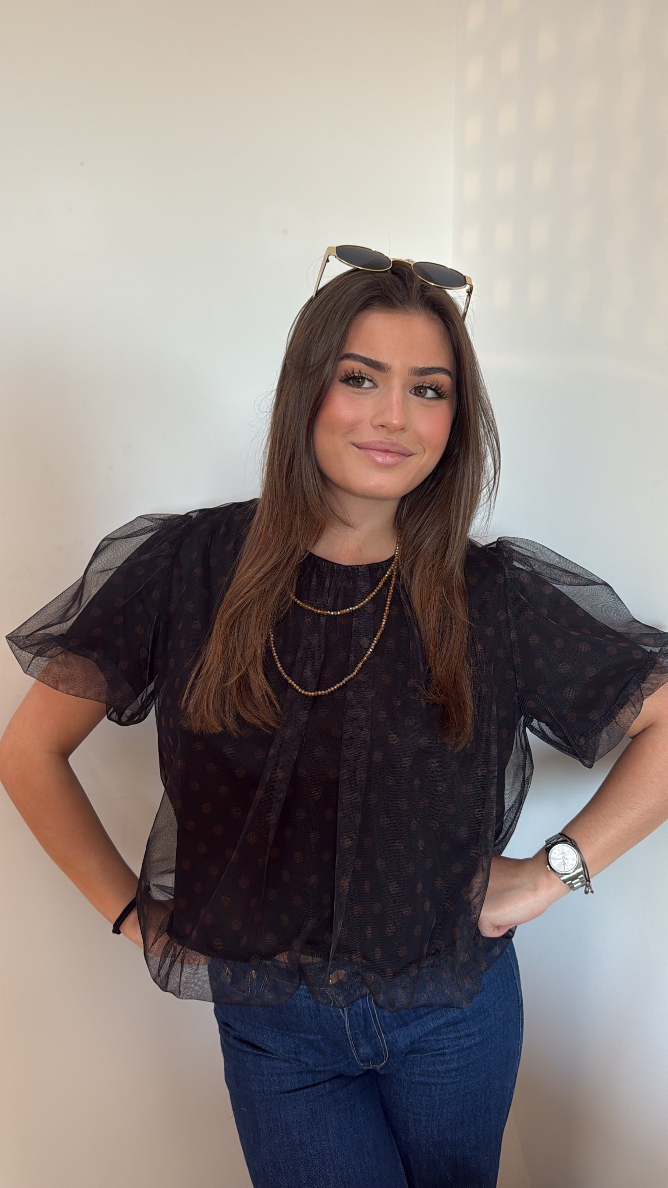Le haut "Margaux" allie féminité et modernité avec son tissu léger et légèrement transparent à pois. Sa coupe fluide et ses manches courtes bouffantes en voile apportent une touche aérienne et raffinée à toutes vos tenues. Parfait pour une sortie, un dîner ou une occasion spéciale, il se porte aussi bien avec un jean qu’une jupe pour un look chic et sans effort.